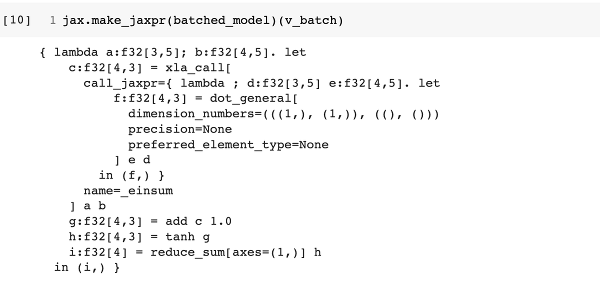 The details differ slightly — for example, xla_call comes from the fact that einsum is jit compiled — but the essential steps in the computation match more-or-less exactly: dot_general(), then add(), then tanh(), then reduce_sum().