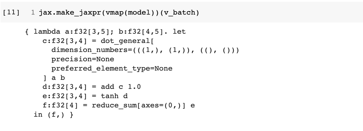You might ask now which approach is more efficient: surely vmap must come at a cost? In most cases, however, vmap will produce virtually identical operations as the manual implementation, which we can see by printing the jaxpr (JAX's internal function representation) for each.