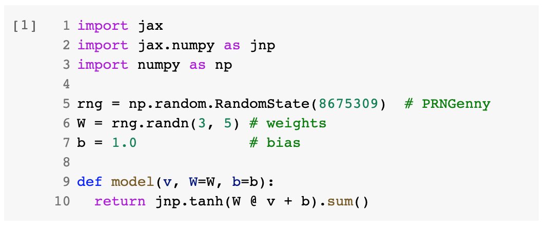 This works, of course, but if you're familiar with NumPy-style computing in Python you'll immediately recognize the problem: loops in Python are typically slow compared to the native vectorized operations offered by NumPy & JAX.
