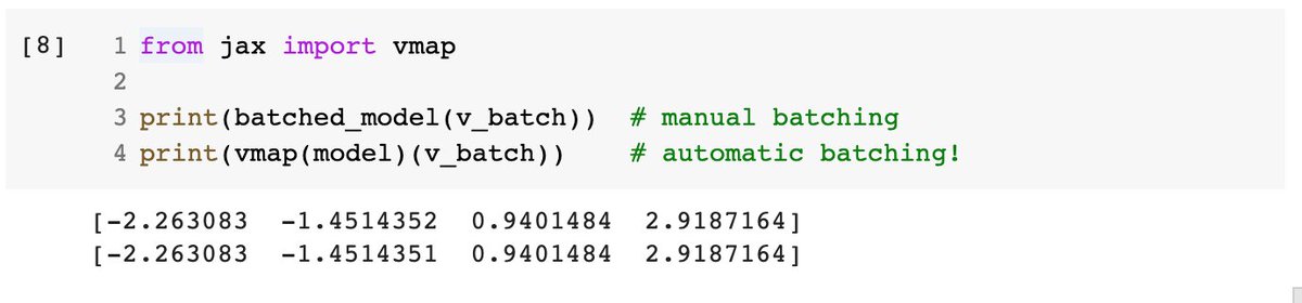 And this is what jax.vmap gives you: a way to automatically create efficient batched versions of your functions – that will lower to fast vectorized computations – without having to re-write your code by hand. You can read more about vmap in the JAX docs: https://jax.readthedocs.io/en/...