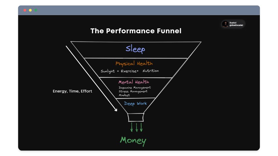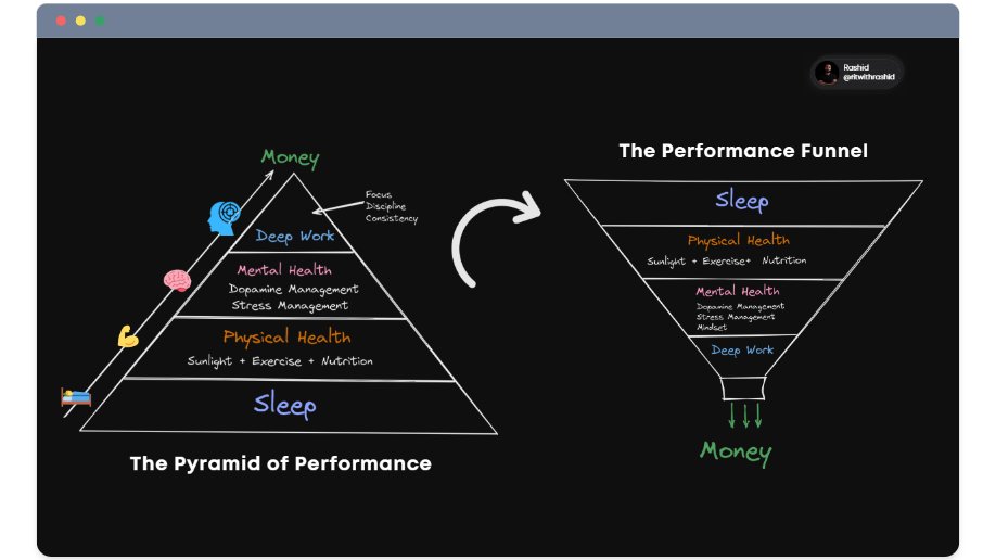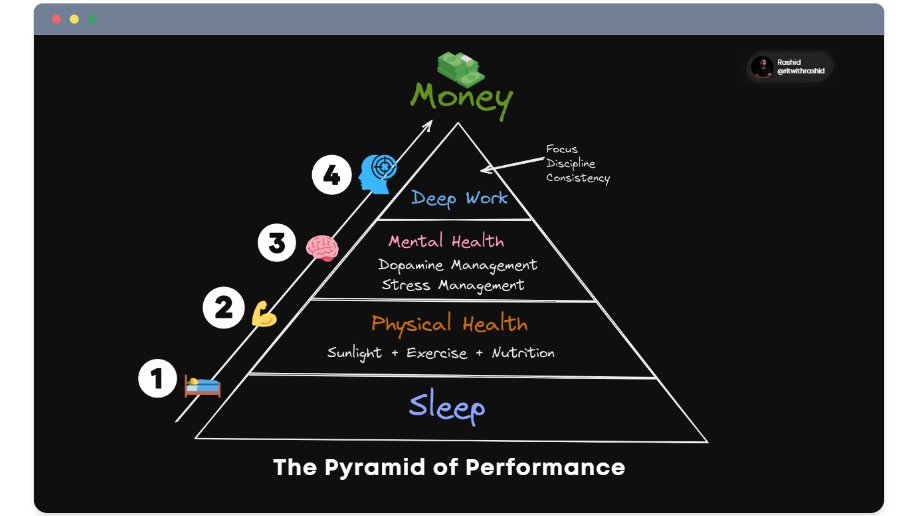 The Pyramid of Performance: A Simple 4-Step Framework for Optimizing Your Health & Performance to earn more money 1. Optimize your Sleep 2. Build a strong body 3. Align your mind & environment 4. Daily 3-4 hours of deep work Each layer builds on the other.