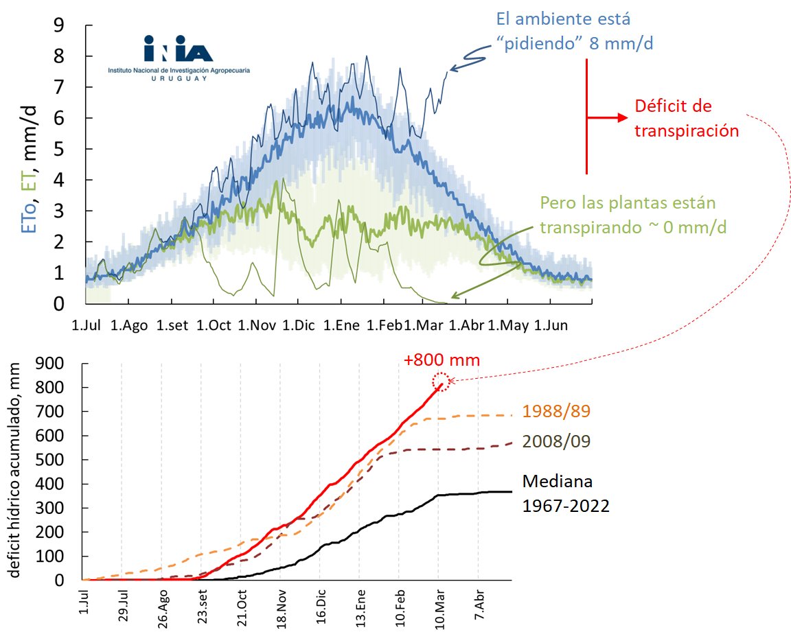 2/11 Segundo, en @INIA La Estanzuela la demanda atmosférica (ETo) ha sido -y sigue siendo- muy alta: 65 mm para los primeros 10 días de marzo! Sumado a muy escasas lluvías, esto resultó en déficit de transpiración récord: +800 mm (diferencia acumulada entre línea azul y verde).