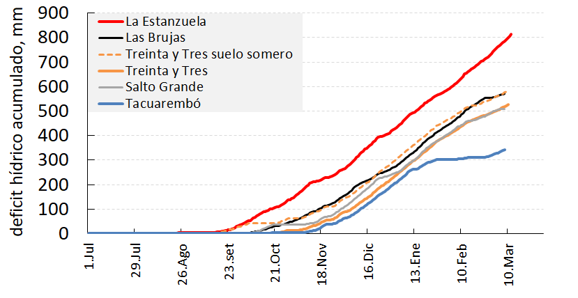 7/11 Para aproximar el nivel de déficit que tuvo su predio, puede sumar lo que llovió desde 15/Sept hasta fin de Feb, y usar la curva de la estación meteorológica más cercana. Si tiene suelo somero, súme 70 mm al valor que muestra el gráfico.