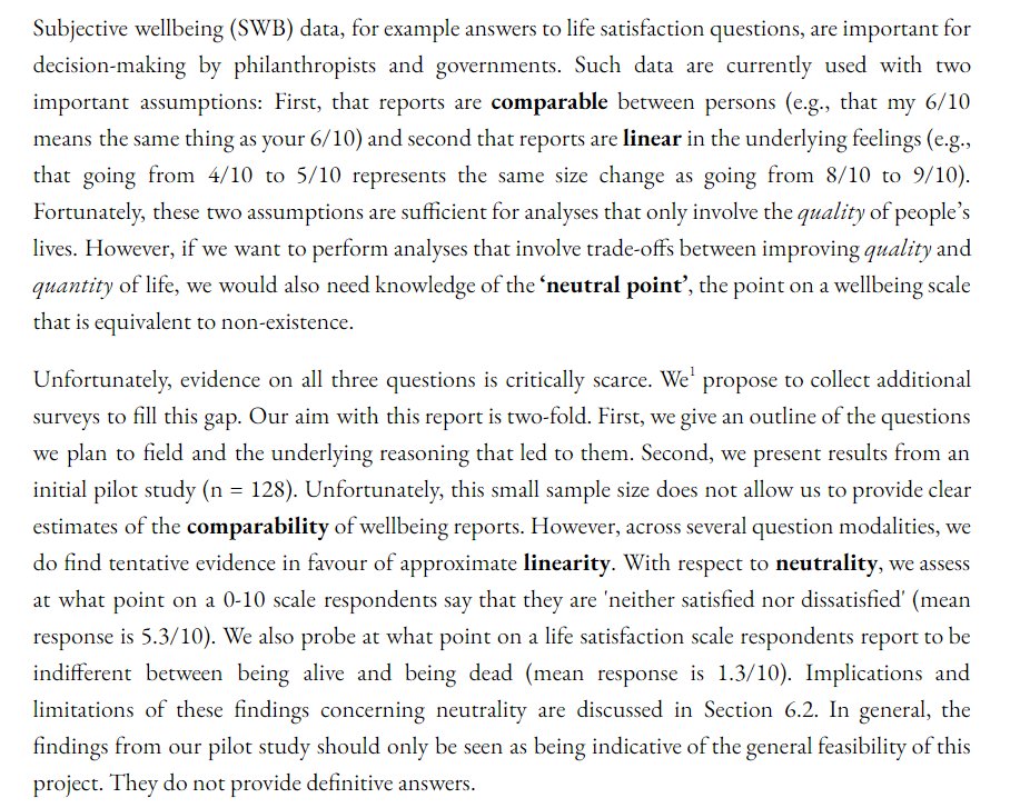 Can we trust happiness surveys? Is my 7/10 = your 7/10? Is going from a 2->3 = to 6->7? While researchers assume yes, the evidence is scarce. @HappierLivesIns, we ran a 50-question pilot survey (n=128) (https://www.happierlivesinstit... Researchers: are we asking the right Qs?🧵1/10