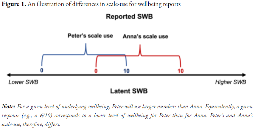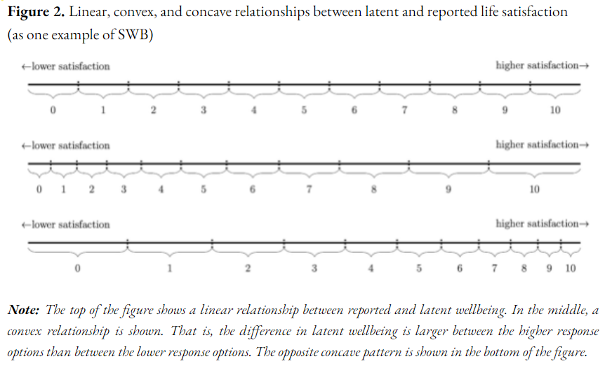 Context: in analysing subjective wellbeing (SWB) questions, researchers often assume that self-reports are: 1. comparable: my 6/10 means the same thing as your 6/10 2. linear: that going from 4/10 to 5/10 represents the same size change as going from 8/10 to 9/10