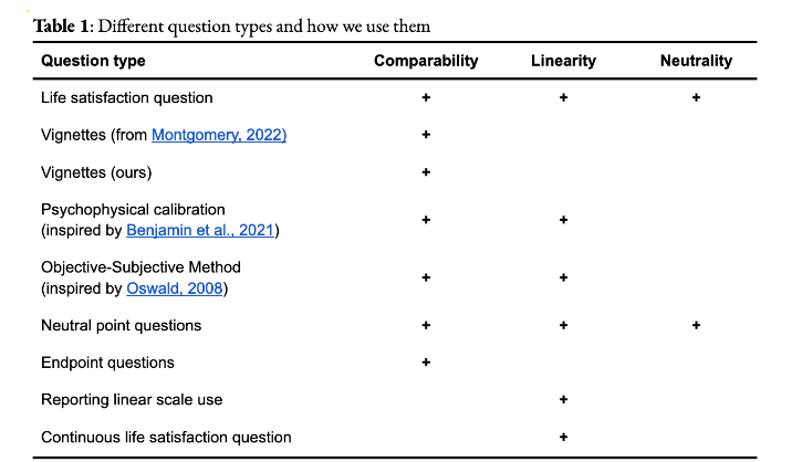 We didn't have a big enough survey to test comparability. We do find evidence for linearity. We're not sure what to make of the answers re neutrality: people think 5/10 on 0-10 scale means zero life satisfaction but life is 'worth living' unless you're very dissatisfied 🤷♂️