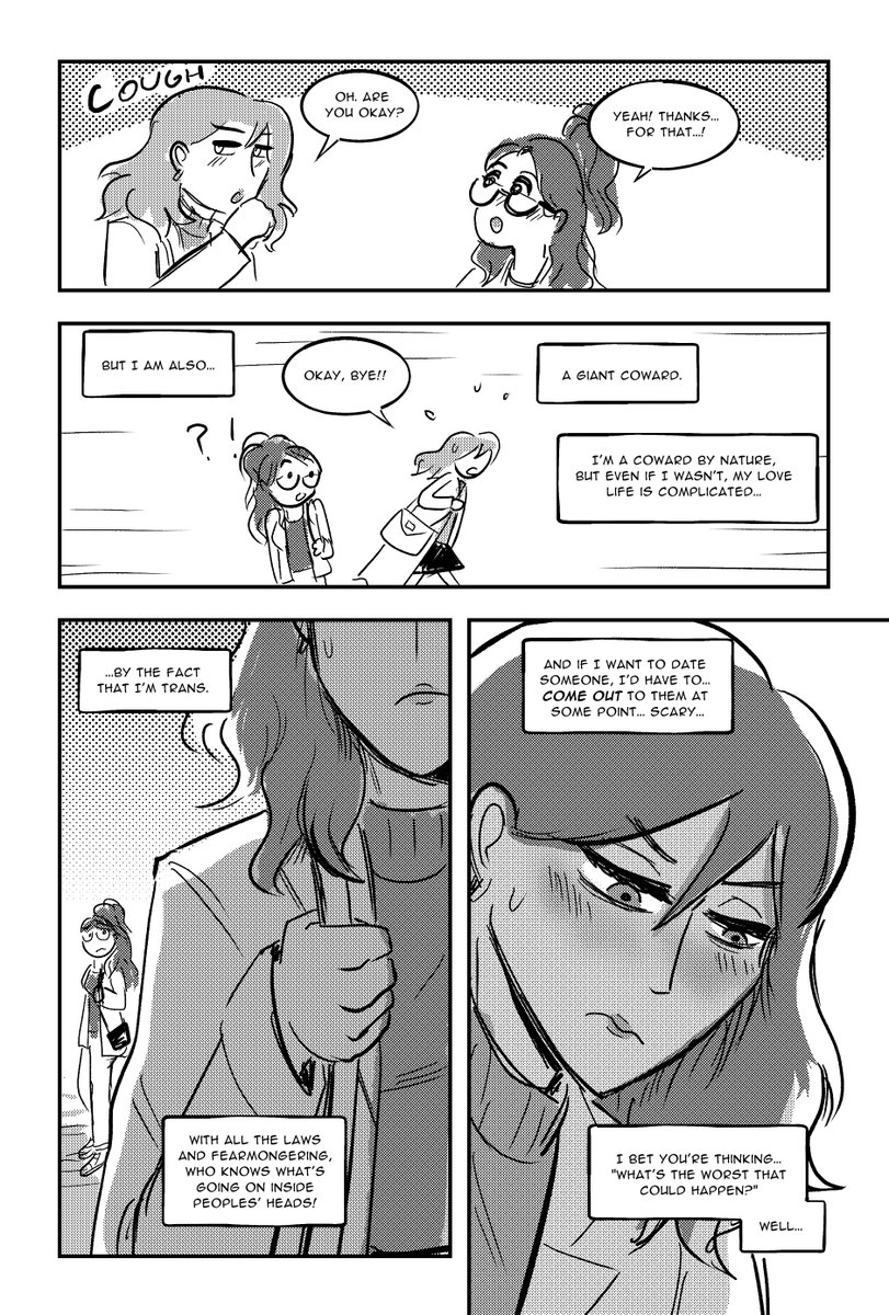 (1/6) I made a short romance comic with a trans lead, because I've been reading a lot of josei romance and wanted to make something inspired by that, but reflective of my own identity as well π CW: mentions of transphobia, sexual innuendo