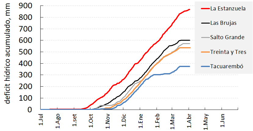 2/11 La magnitud de esta sequía 22/23 -medida como "cuánta agua una pradera no pudo transpirar porque el suelo estaba seco" (=deficit hídrico)- fue muy dispar. En las estaciones meteorológicas de INIA varió de 380 mm en La Magnolia (Tacuarembó) a 880 mm en Estanzuela. @GRAS_INIA