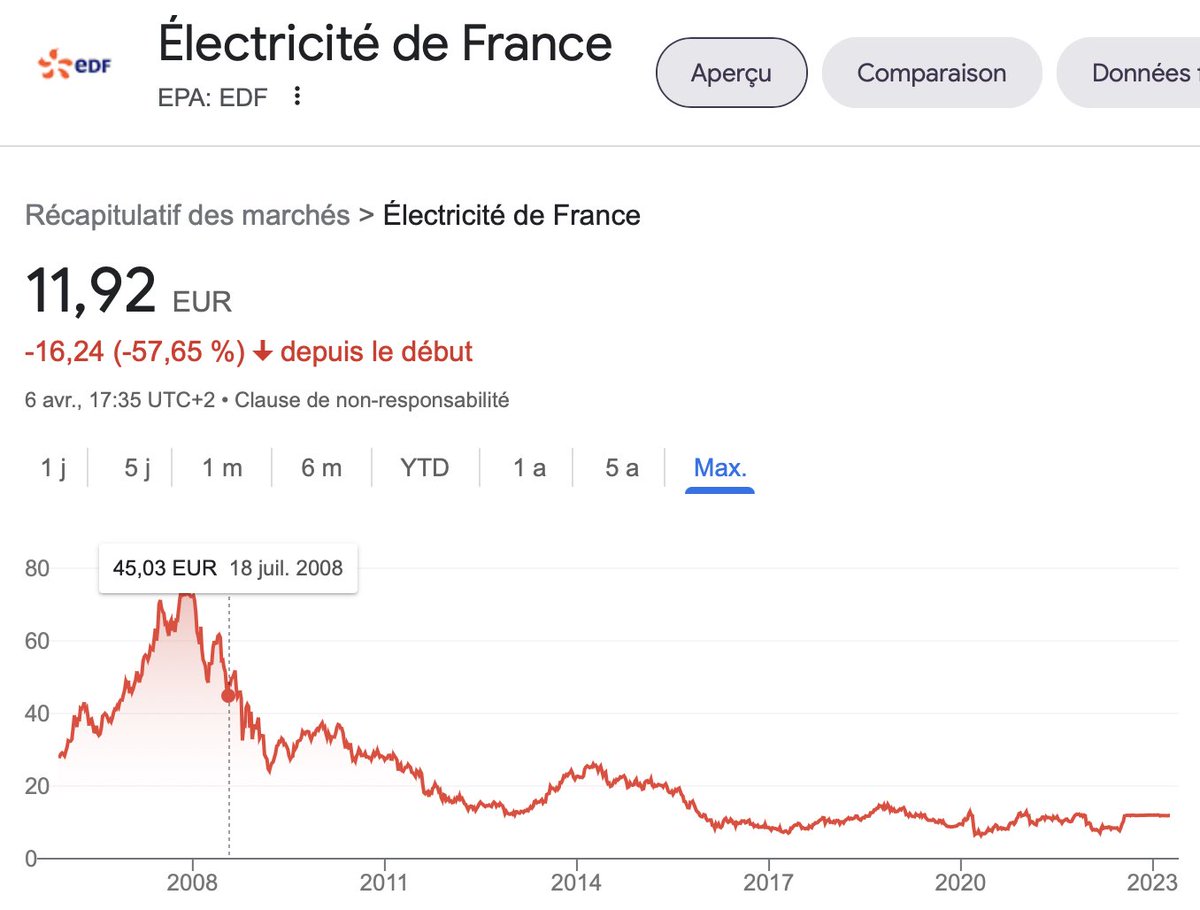 ⚡️EDF (Électricité de France) : l'action a perdu environ 58% de sa valeur depuis son introduction en bourse en 2005.
