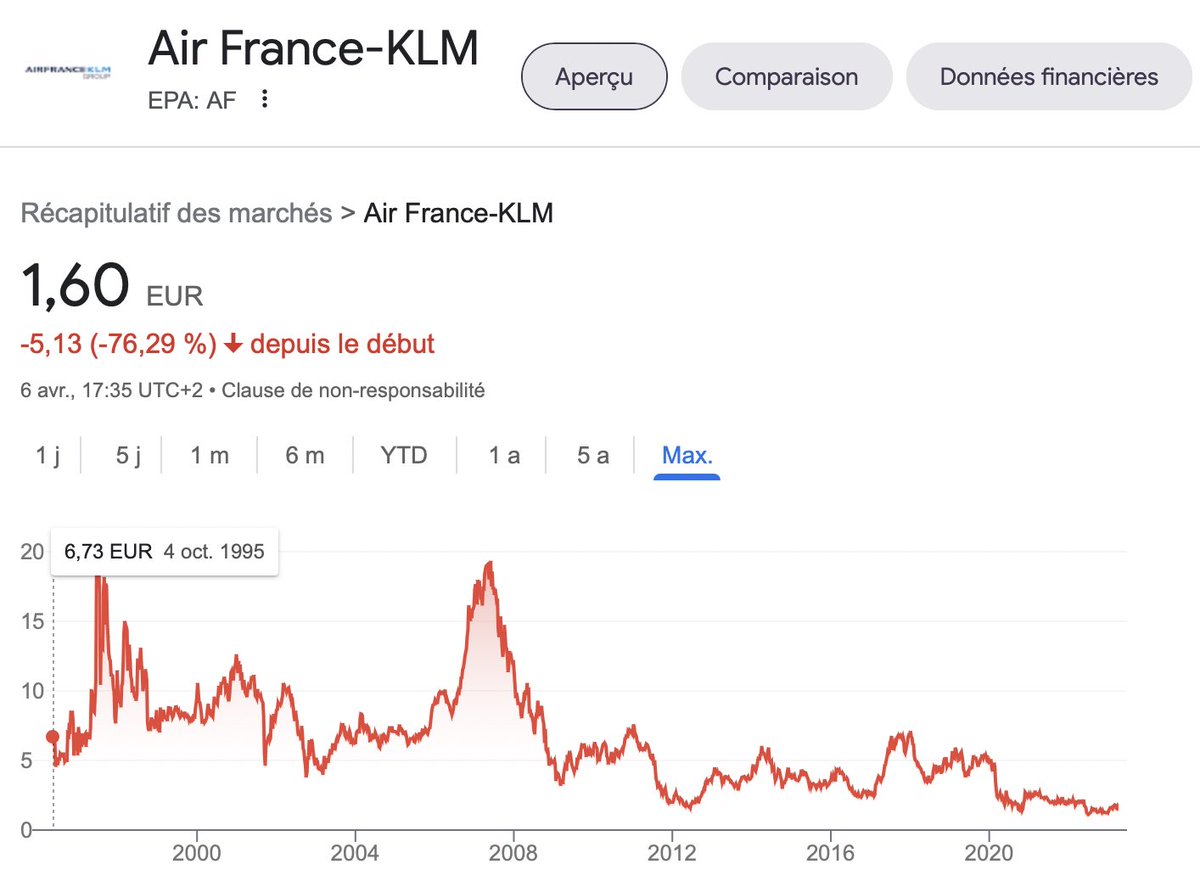 🛩Air France-KLM : la valeur de l'action a chuté de plus de 75% depuis son introduction en 1995