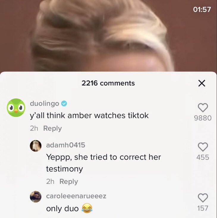 Duolingo commented on a tiktok video about Amber Heard.
