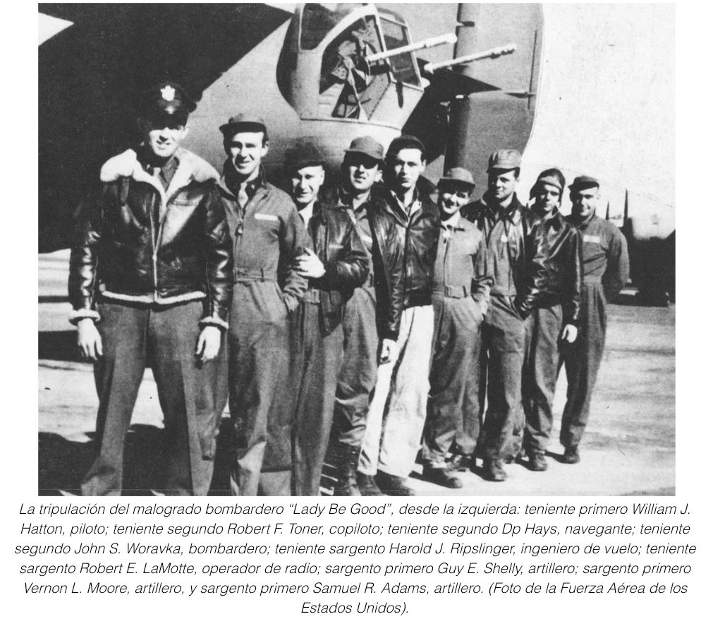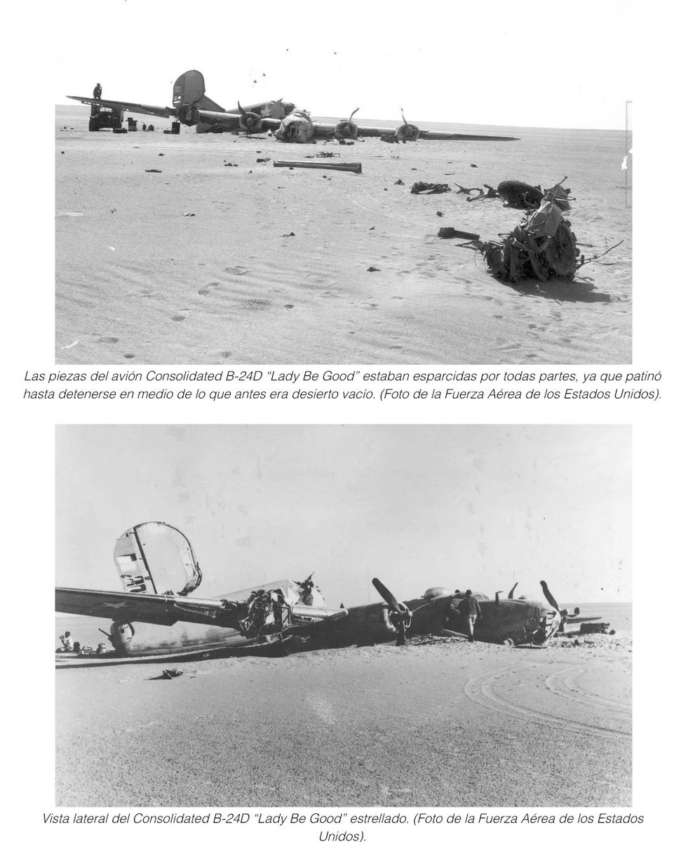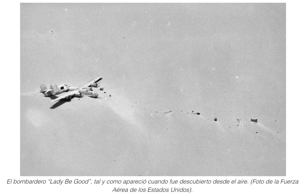 posiblemente provocado por un error en la navegación.En 1958,varios geólogos🇬🇧mientras volaban en el desierto libio,a600kms al sur d Soluch,vieron a un✈️en la arena.El equipo de tierra q llegó al lugar en 1959 descubrió q el✈️era un B-24D. El Lady Be Good había sido encontrado!!