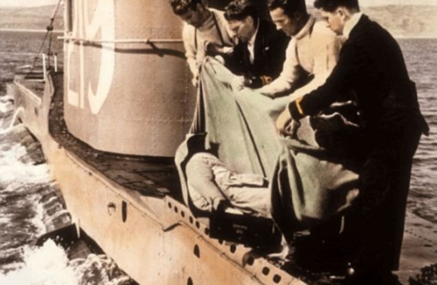 El capitán dl submarino🇬🇧,el teniente Norman Auchinleck🎞️ leyó un pasaje d la Biblia y ordenó q los motores se pusieran a toda potencia,para q la corriente d las helices empujara el cuerpo hacia la orilla.Más tarde envió un mensaje que decía: "Operación carne picada completada"👇