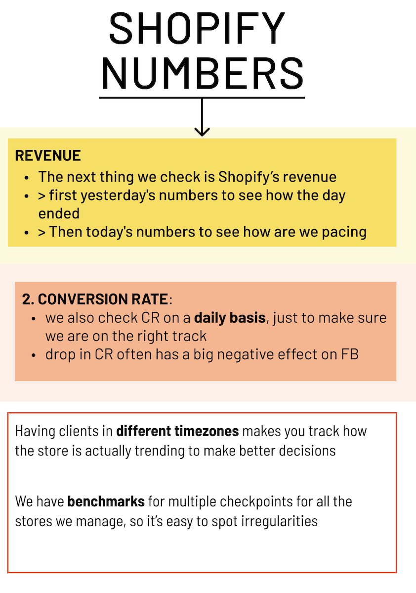 b) Conversion rate > We also check CR on a daily basis, just to make sure we are on the right track due to the CR affect on FB Having clients in different timezones makes you track how the store is actually trending to make better decisions