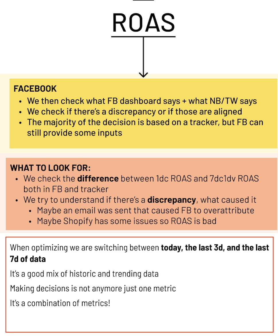 3. FB ROAS + 3rd party tracker ROAS We then check what FB dashboard says + what NB/TW says We check if there’s a discrepancy or if those are aligned The majority of the decision is based on a tracker, but FB can still provide some inputs