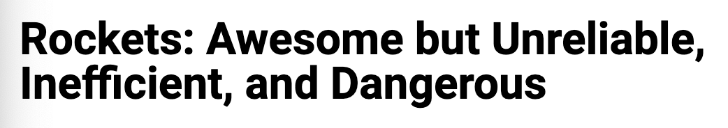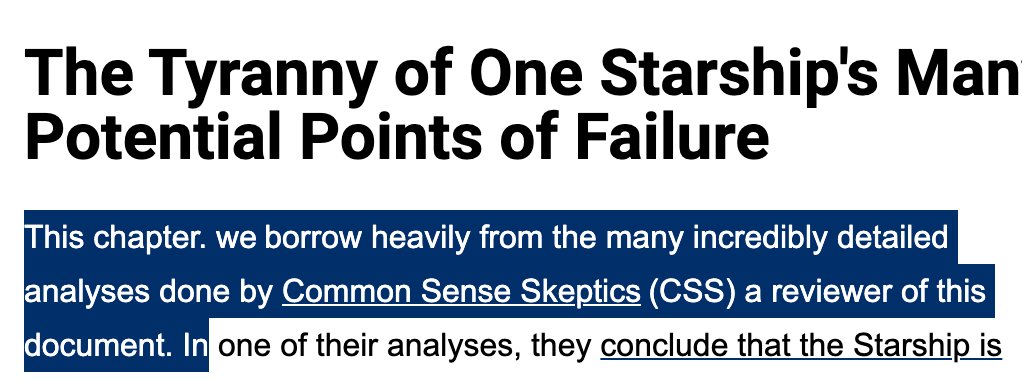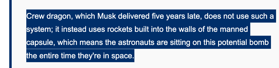 They also include a long block quote of CSS criticizing SpaceX's abort system, which is incredibly dumb on every level, but most notably in that it includes no criticism of Boeing's Starliner, which is later than Dragon and uses the same escape system.