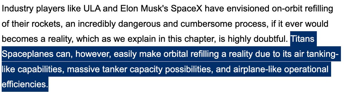 They then spend a long time dragging orbital refueling via rocket, and say that their spaceplane solves all of this because it operates like an airplane.
