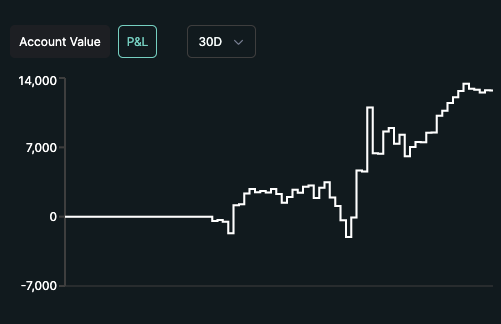 7/ How's it going so far? HLP is a MM strategy honed on adversarial CEX order books. Its per trade expectancy is tuned to be positive on short markouts. For example, 15/15 days have had positive 5 minute markout pnl so far. Cumulative (real) pnl graph so far.