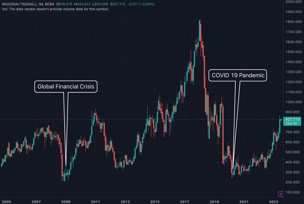 3/ The absolute best entry points over the last 2 decades have been a major international crisis combined with Peronists in power. That's about as safe an entry you can get for Argentine equities. Argentina's MERVAL index expressed in US Dollars 👇
