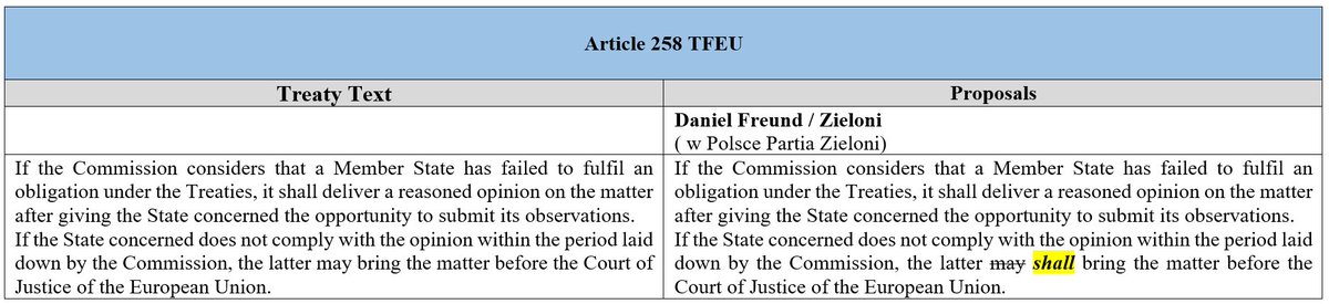86./ Zieloni, w ramach reformy art. 258 TFUE, nt. postępowania naruszeniowego poprzedzającego ewentualne wniesienie skargi do TSUE, proponują zmianę możliwości rozpoczęcia całego procesu w obowiązek. W świetle nowej zmiany, Komisja Europejska będzie zobligowana do wszczęcia sporu na drodze sądowej nawet jeżeli uzna, że Państwo Członkowskie w odpowiedzi na uzasadnioną opinię przedstawiło wyczerpujące argumenty, dlaczego nie powinno się do tej uzasadnionej opinii stosować. Proponowane rozwiązanie jest skrajnie nieprzemyślane, gdyż niepotrzebnie zwiąże ręce Komisji, która straci swoją władzę dyskrecjonalną w zakresie stania na straży Traktatów. W praktyce, ten nowy obowiązek doprowadzi do całkowitego paraliżu UE jako sprawnie funkcjonującej organizacji, gdyż cały system unijny ugiąłby się pod ciężarem pieniactwa i niewydolności sądowej. Powyższa propozycja, motywowana rzekomym żądaniem obywateli UE, by naruszenia praworządności były karane, prezentuje zideologizowane stanowisko, które uderza w fundamentalne prawa Państw Członkowskich.