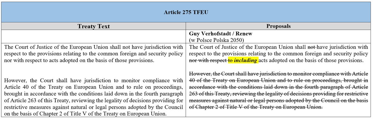 89./ W ramach reformy art. 275 TFUE, liberałowie z Renew chcą rozszerzenia kognicji TSUE na sprawy z zakresu wspólnej polityki zagranicznej i bezpieczeństwa. Jest to konsekwencja zmian wprowadzonych w TUE, art. 24 i 36. Dla przypomnienia zmiana art. 24 TUE dotyczy zmiany sposobu podejmowania decyzji w dziedzinie wspólnej polityki zagranicznej i bezpieczeństwa. Dotychczasową tryb jednomyślności miałby zostać zastąpiony większością kwalifikowaną. Wspólna polityka zagraniczne i bezpieczeństwa jest niezwykle wrażliwym obszarem polityki oraz domeną, gdzie decyzje podejmują Państwa Członkowskie na równych zasadach. Realizacja tego postulatu doprowadziłaby do dalszego wzmocnienia Francji i Niemiec kosztem pozostałych państw. Należy podkreślić, że prawo weta jest jednym z najważniejszych instrumentów, które małe i średnie Państwa Członkowskie wykorzystują do obrony swoich żywotnych interesów. Jego likwidacja weta spowodowałaby rażące zaburzenie równowagi w instytucjach międzyrządowych oraz mogłaby przyspieszyć dezintegrację Unii. Natomiast zmiana art.36 TUE dotyczy wzmocnienia roli Parlamentu Europejskiego w dziedzinie wspólnej polityki zagranicznej i bezpieczeństwa. W proponowanej wersji Parlament Europejski ma udzielać instrukcji Wysokiemu Przedstawicielowi Unii do spraw zagranicznych i polityki bezpieczeństwa, a rekomendacje PE dla Wysokiego Przedstawiciela mają być prawnie wiążące. Postulowane zmiany doprowadzą do zaburzenia równowagi instytucjonalnej oraz destabilizacji polityki unijnej. Wspólna polityka zagraniczna i bezpieczeństwa to obszar wrażliwy i jako taki powinien pozostać w gestii decyzji Państw Członkowskich, które są reprezentowane na forum Rady Europejskiej i Rady Unii Europejskiej.