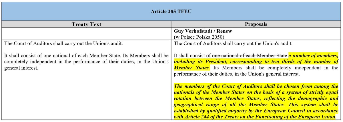 90./ W ramach reformy art. 285 TFUE, przedstawiciel Renew proponuje wprowadzenie istotnych zmian w zakresie składu Europejskiego Trybunału Obrachunkowego, ETO, w którego skład wchodzi obecnie jeden obywatel z każdego Państwa Członkowskiego. Renew chce ograniczenia tej liczby do 2/3 Państw Członkowskich z odzwierciedleniem zasięgu demograficznego i geograficznego. Dodatkowo nowy skład ETO miałby być powoływany większością kwalifikowaną. Ta propozycja idzie w kierunku federalizacji Unii i docelowo doprowadzi do osłabienia Państw Członkowskich.