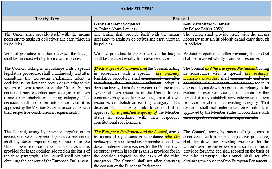 93./ W ramach reformy art. 311 TFUE, dotyczącego zasobów własnych Unii, socjaliści i liberałowie chcą zmiany sposobu decydowania o ustanawianiu nowych lub uchylaniu obowiązujących kategorii zasobów własnych. Obecnie Rada stanowi jednomyślnie i jedynie konsultuje się z Parlamentem Europejskim. Po wprowadzeniu postulowanej zmiany na głosowanie większością kwalifikowaną, Państwa Członkowskie zostaną pozbawione możliwości wpływania na kształt budżetu oraz stracą kartę przetargową w kluczowych unijnych negocjacjach. Małe i średnie Państwa Członkowskie nie będą bowiem w stanie zbudować większości blokującej, co poważnie zaszkodzi ich interesom. Ponadto, najbardziej ucierpią na tych zmianach mniej zamożne Państwa Członkowskie, którym uniemożliwi to przeciwstawienie się wprowadzeniu nowych, nadmiernie obciążających de facto podatków unijnych, mających na celu sfinansowanie kosztów polityki klimatyczno-energetycznej, stworzonej bez uwzględnienia występujących obecnie dysproporcji rozwojowych.