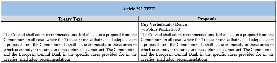92./ Liberałowie, w ramach reformy art. 292 TFUE, dot. zaleceń, chcą wykreślenia zasady, zgodnie z którą Rada stanowi jednomyślnie w dziedzinach, w których jednomyślność wymagana jest do przyjęcia aktu unijnego. Powyższa propozycja jest konsekwencją szeregu forsowanych zapisów dot. zastąpienia jednomyślności głosowaniem większościowym, które de facto pozbawi pojedyncze Państwa Członkowskie prawa weta w nawet najbardziej istotnych z punktu widzenia bezpieczeństwa państwa i suwerenności obszarach. Gdyby znieść jednomyślność we wszystkich obszarach, to w konsekwencji ten przepis art. 292 TFUE utraci rację bytu.