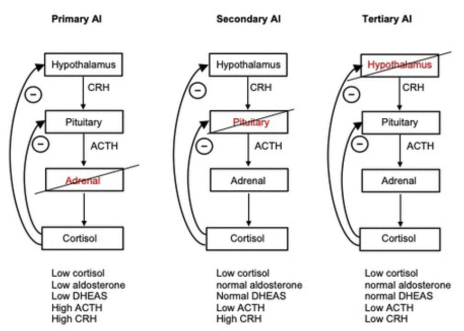 Recall: Secondary adrenal insufficiency does NOT have hyperpigmentation of skin/mucosa OR hyperkalemia (due to intact RAAS system!) Causes of 2ndary adrenal insufficiency = Decreased pituitary ACTH production Mnemonic: "Secondary Spares Skin" whereas "Primary Pigments"