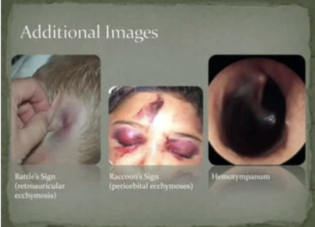 HY Association: If someone presents after a car crash and they have similar raccoon eyes, what is your diagnosis? - Basilar skull fracture! *Can have high CHLORIDE clear fluid draining from nose = CSF from fractured cribriform plate! Look for: mastoid ecchymosis (Battle sign)