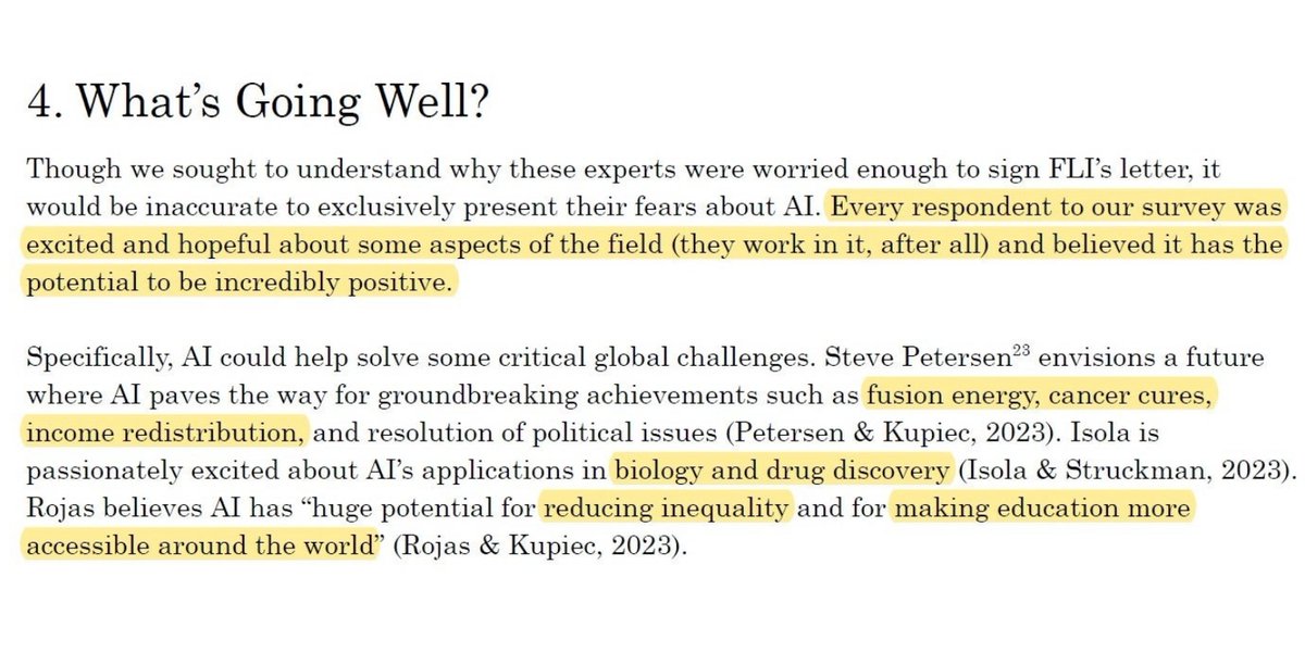 AI is "a tool for addressing global challenges, promoting equality, enabling creative expression & furthering scientific knowledge It elicits a sense of wonder & anticipation among these signatories Whatever their worries, most of them are technologists & enthusiasts first." 8