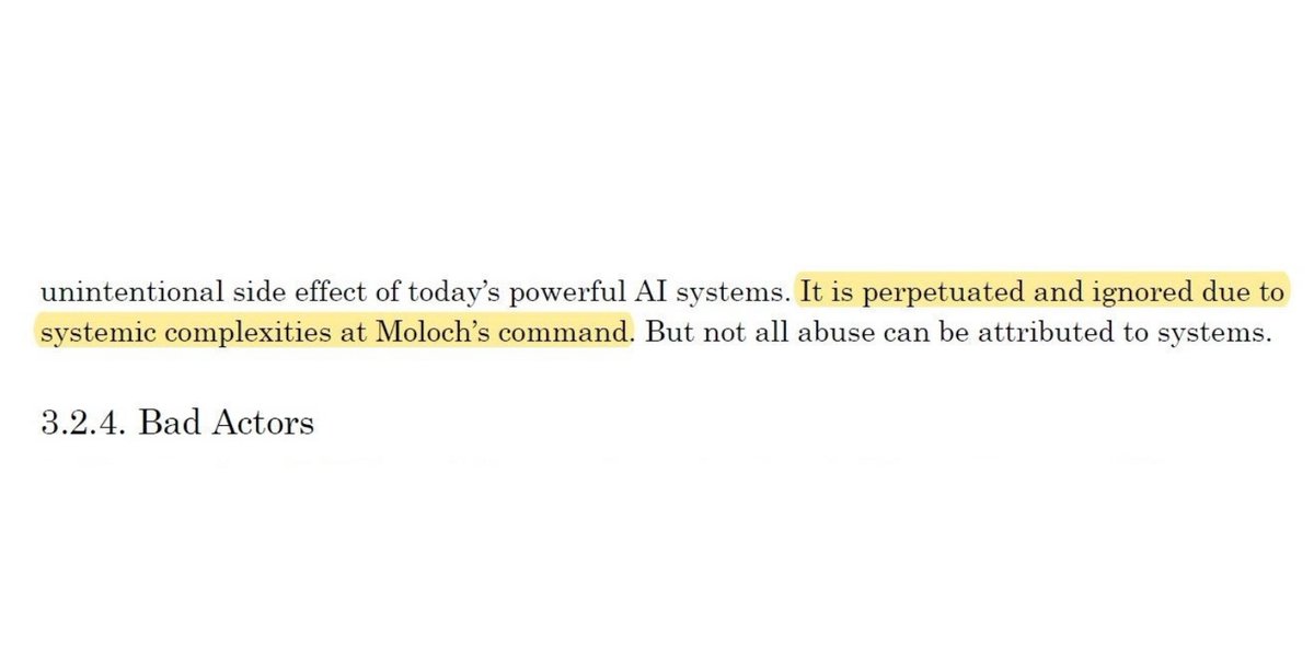 Final note: While none of the signatories mentioned it, the "Moloch" appears 28 times to frame their quotes. (@Tegmark made the analogy on @lexfridman's podcast) When "Moloch-driven industry/forces" became "systematic complexities at Moloch's command," it was just too much. 11