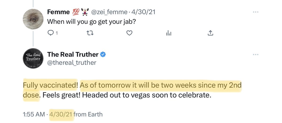 It would be completely out of character for @thereal_truther to not play fast-and-loose with the facts, and even when it comes to something as fundamental as the dates of his jabs, he does not disappoint. 13/