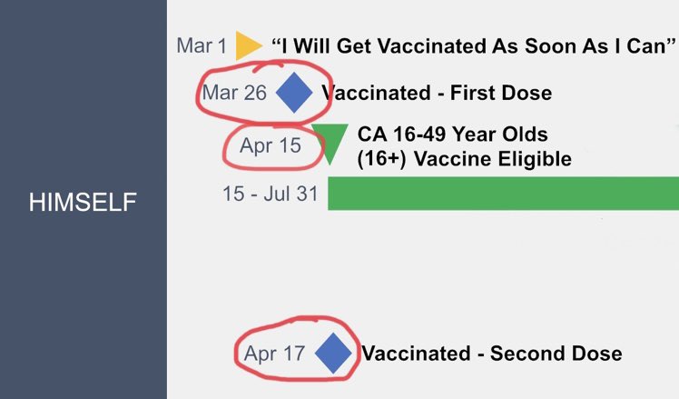 HIS TIMELINE Reviewing his timeline, the following is indisputable: 1) He was fully committed to vaccinating himself, as he told us on 3/1/21: “Which is why I will get vaccinated as soon as I can!” 2) True to his word, he received his first dose 25 days later on 3/26/21. 6/