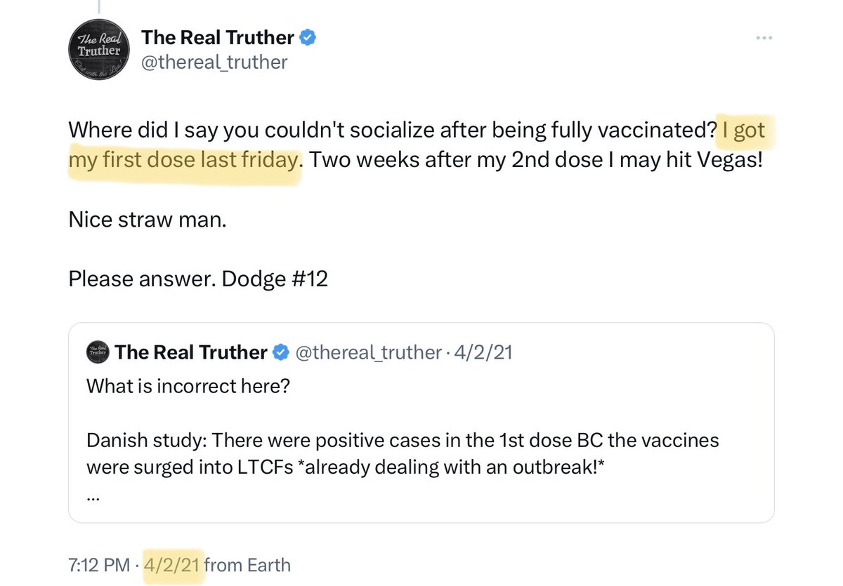 Frankly, his confusion surrounding the dates of his own vaccination is such, that it’s reasonable to wonder if he’s even vaxxed. But, one thing is clear: No individual is a more manipulative proponent of COVID vaccination, or a more dishonest hypocrite, than @thereal_truther. /27