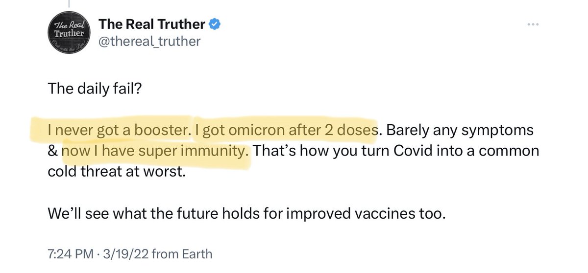 D) He has long made flippant excuses for why he’s not boosted; like on 3/19/22 claiming that he has, “Super Immunity.” The fact that he would then turnaround 3 days later & claim, “Anyone can benefit from at least one dose post-infection,” shows him for the hypocrite he is. 19/