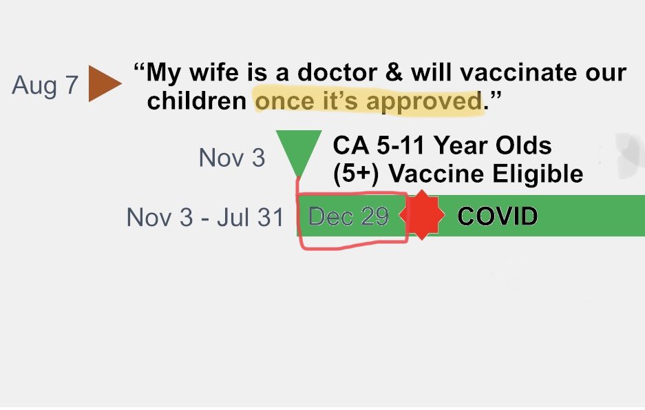 CHILDREN’S TIMELINE 7) On 8/07/21 he was fully committed to vaccinating his children, saying: “My wife is a doctor & will vaccinate our children once it’s approved.” 8) CA 5-11 year olds were eligible for the Pfizer vaccine on 11/3/21. 10/