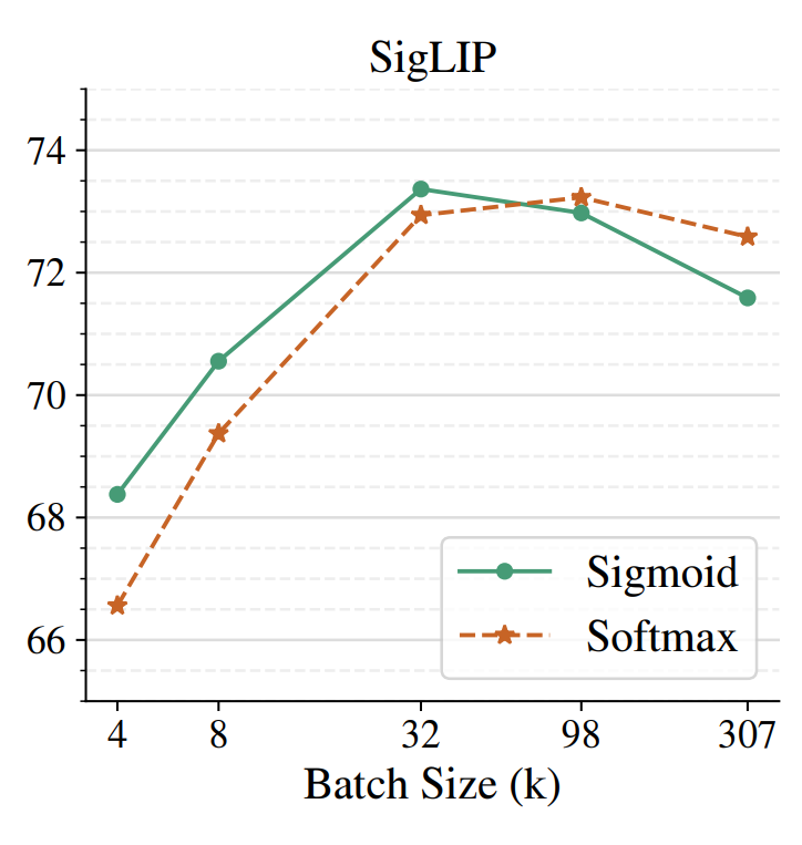 Surprisingly, we find that both SigLIP and CLIP both plateau at batch-sizes not much larger than 32k, originally used in CLIP. We also investigate the LiT (https://arxiv.org/abs/2111.079... setting, where we can reach batch-size of 1 Million. However, we see almost no benefit beyond 32k.