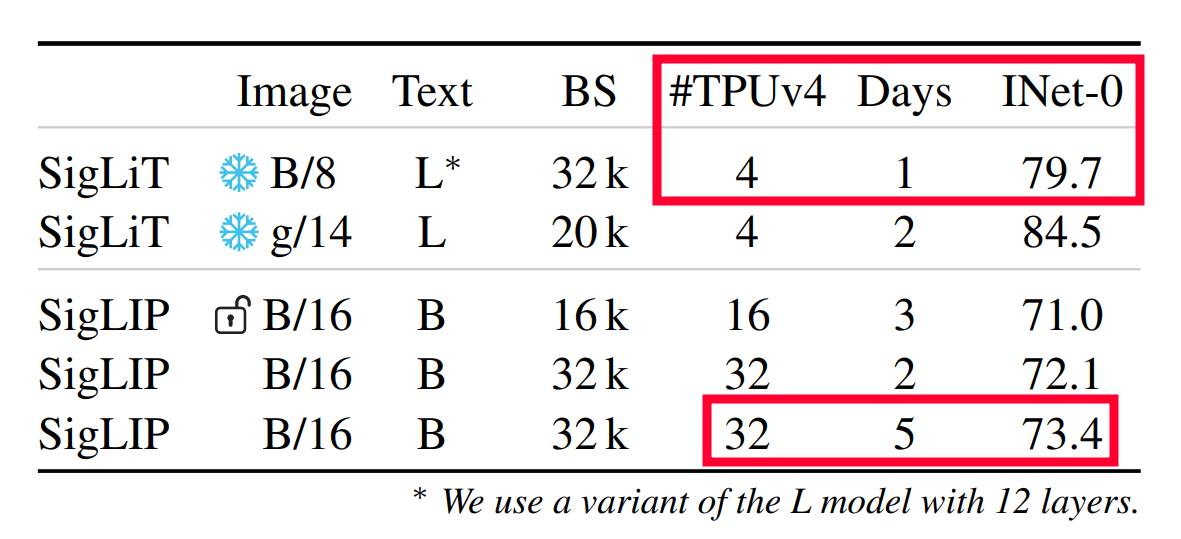 Next, we push efficiency to the extreme: - With SigLiT we get to 80% ImageNet 0shot in just 1 day on 4 devices(!!) - With SigLIP we get to 73% in 5 days on 32 devices. This is MUCH better than OpenAI (256 for 12 days?) and OpenCLIP (800? for ? days)