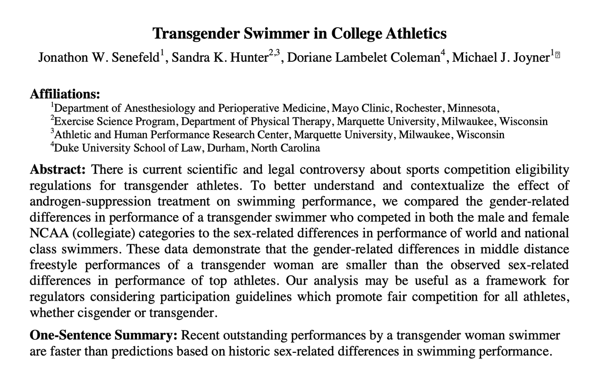 I'll post studies examining the competitiveness in sports of transgender women compared with cisgender women in the thread: "The 15–31% athletic advantage that transwomen displayed over their female counterparts prior to starting gender affirming hormones declined with feminising therapy. However, transwomen still had a 9% faster mean run speed after the 1 year period of testosterone suppression that is recommended by World Athletics for inclusion in women’s events." 2/ https://bjsm.bmj.com/content/5...