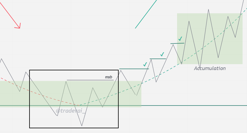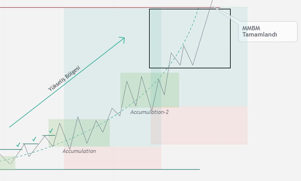 ▫️ Reversal sonrası target'a kadar oluşan fiyat hareketi akümülasyon bölgeleridir. Buralar fiyatın alıcılar tarafından akümüle edilip Target'a yollanacağı yerlerdir. Akümülasyon bölgeleri yüksek RR'lı işlem almanızı sağlar. (İşem stratejilerine diğer partta değineceğim)