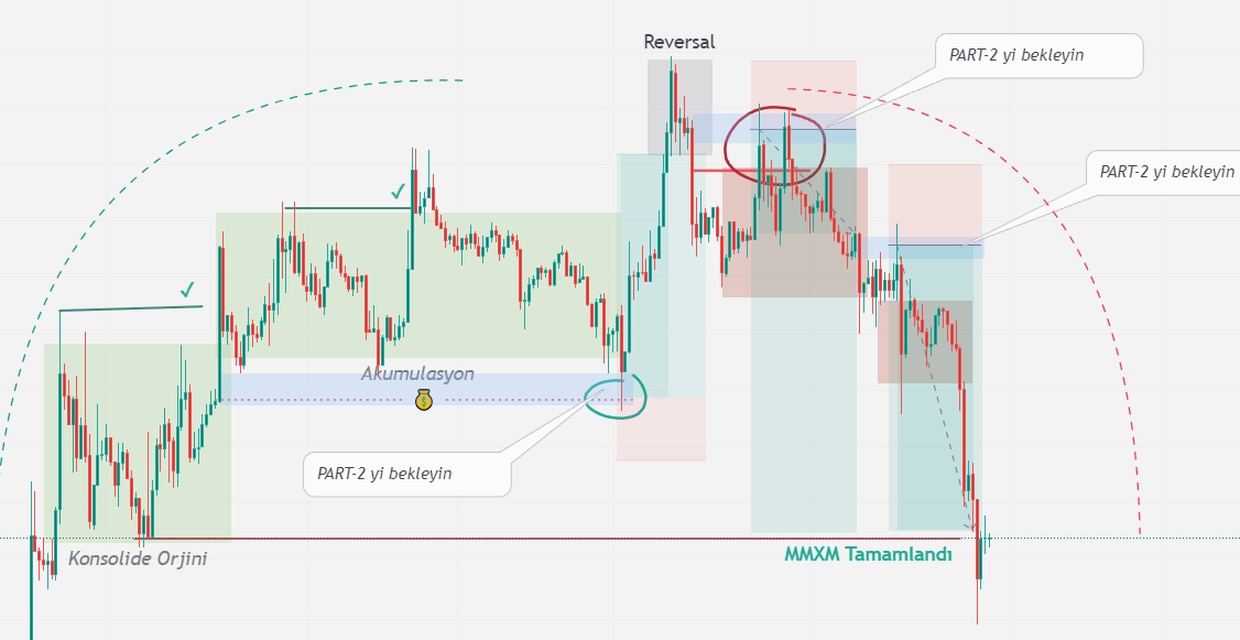 ▪️ MMSM: Original Konsolide Bölgesi > Accumulation > Reversal > Distrubation > Target Fiyatın Yükselişi başlatan HTF Orjininden tekrar o bölgeye doğru düşüş hareketine MMSM deriz.