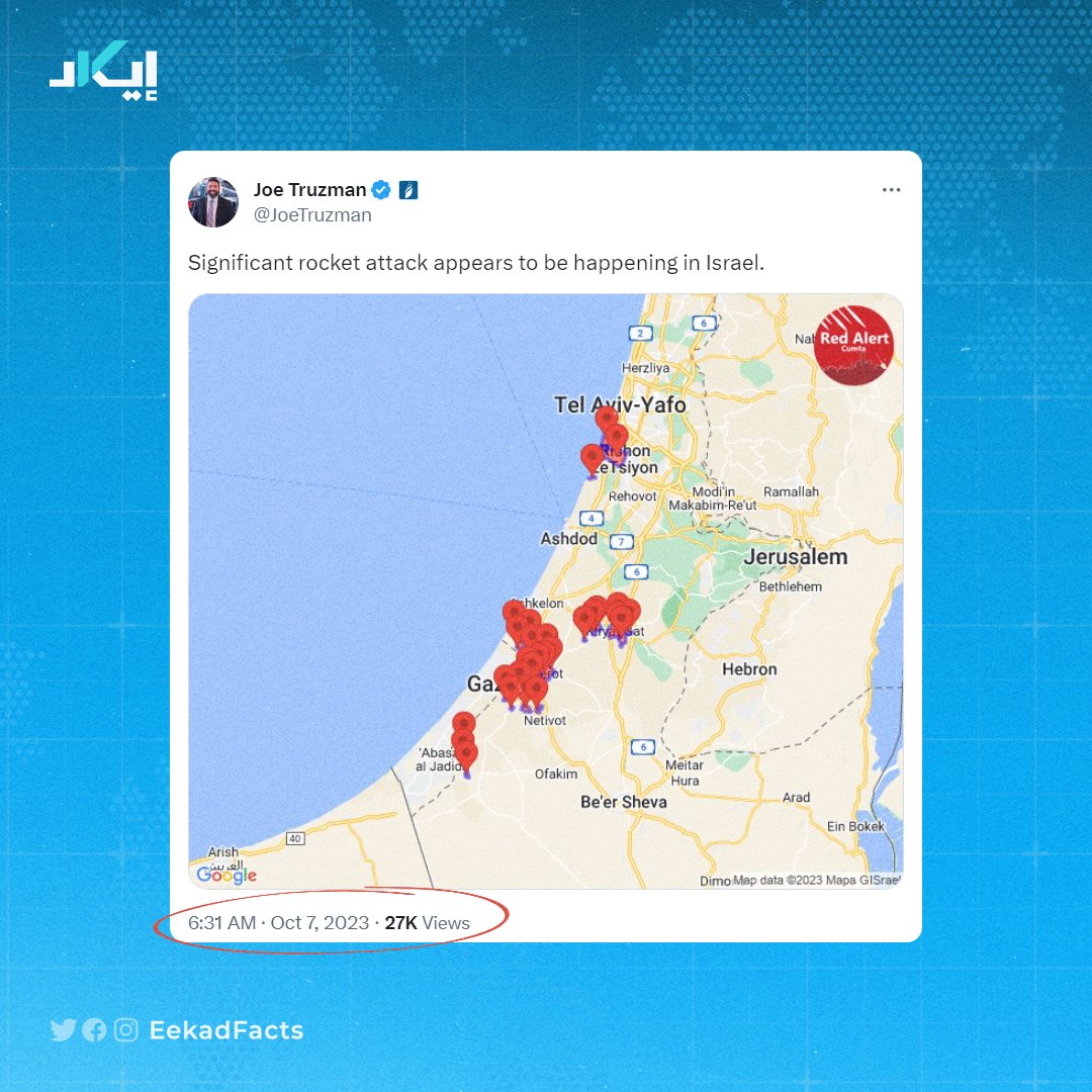 ✔️ تتبعنا التسلسل الزمني منذ بدء ظهور مقاطع فيديو وأخبار توثق العملية العسكرية، لنجد أن أول إعلان لدوي صافرات الإنذار التحذيرية في مدن غلاف غزة كان في صباح اليوم السبت، تحديدًا في الساعة 6:31 صباحًا.