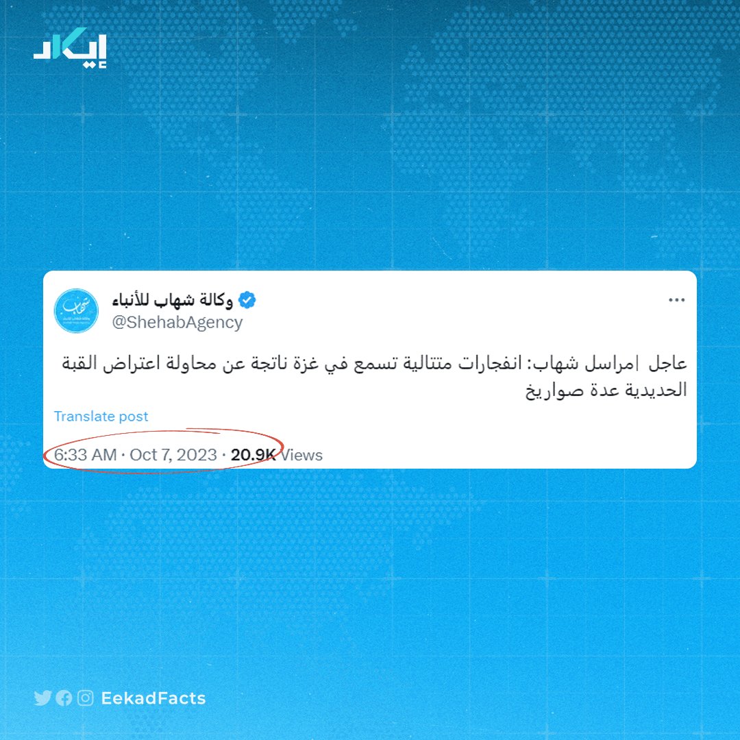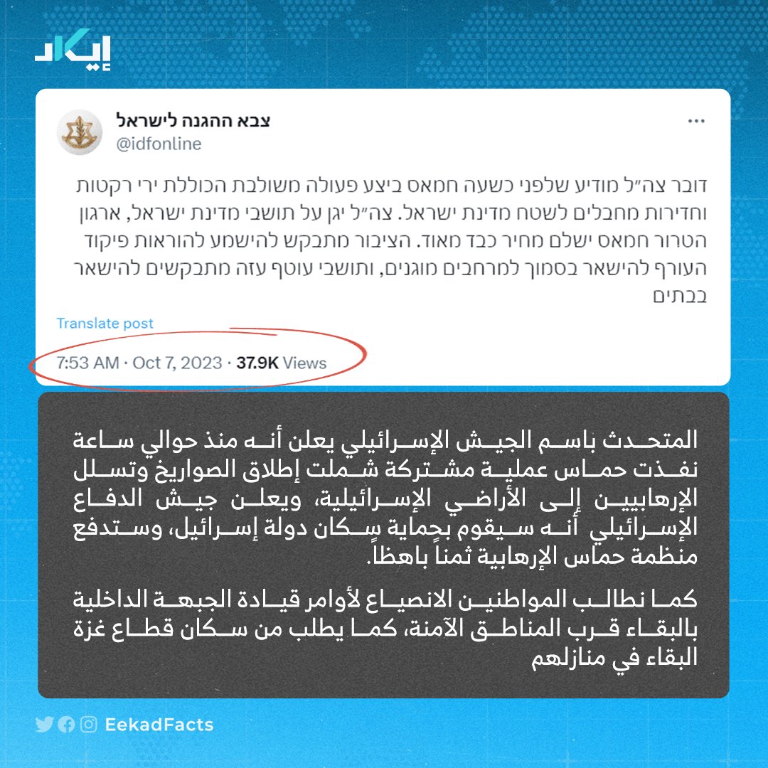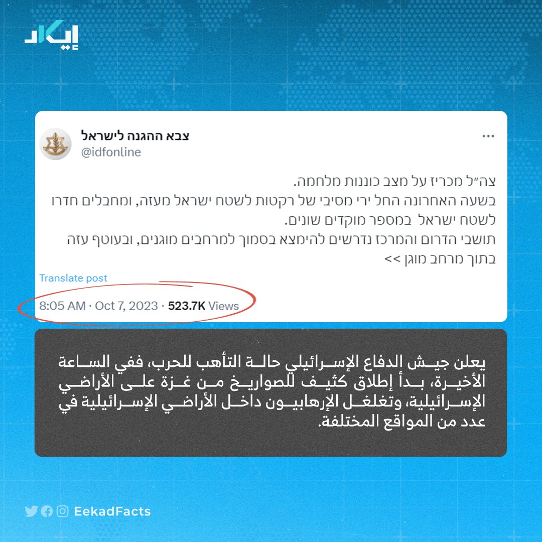 ✔️ لم نجد أي إعلان إسرائيلي يدعو للتعبئة وبدء المواجهة حتى الساعة 8:05 صباحًا. ✔️ حينها أعلن حساب الجيش الإسرائيلي حالة الحرب في عموم البلاد، وأُعلن بعدها استدعاء واسع النطاق لجنود الاحتياط. ✔️ هذا يعني أن الأمر استغرق قرابة الساعة والنصف بعد بدء عملية الاقتحام.