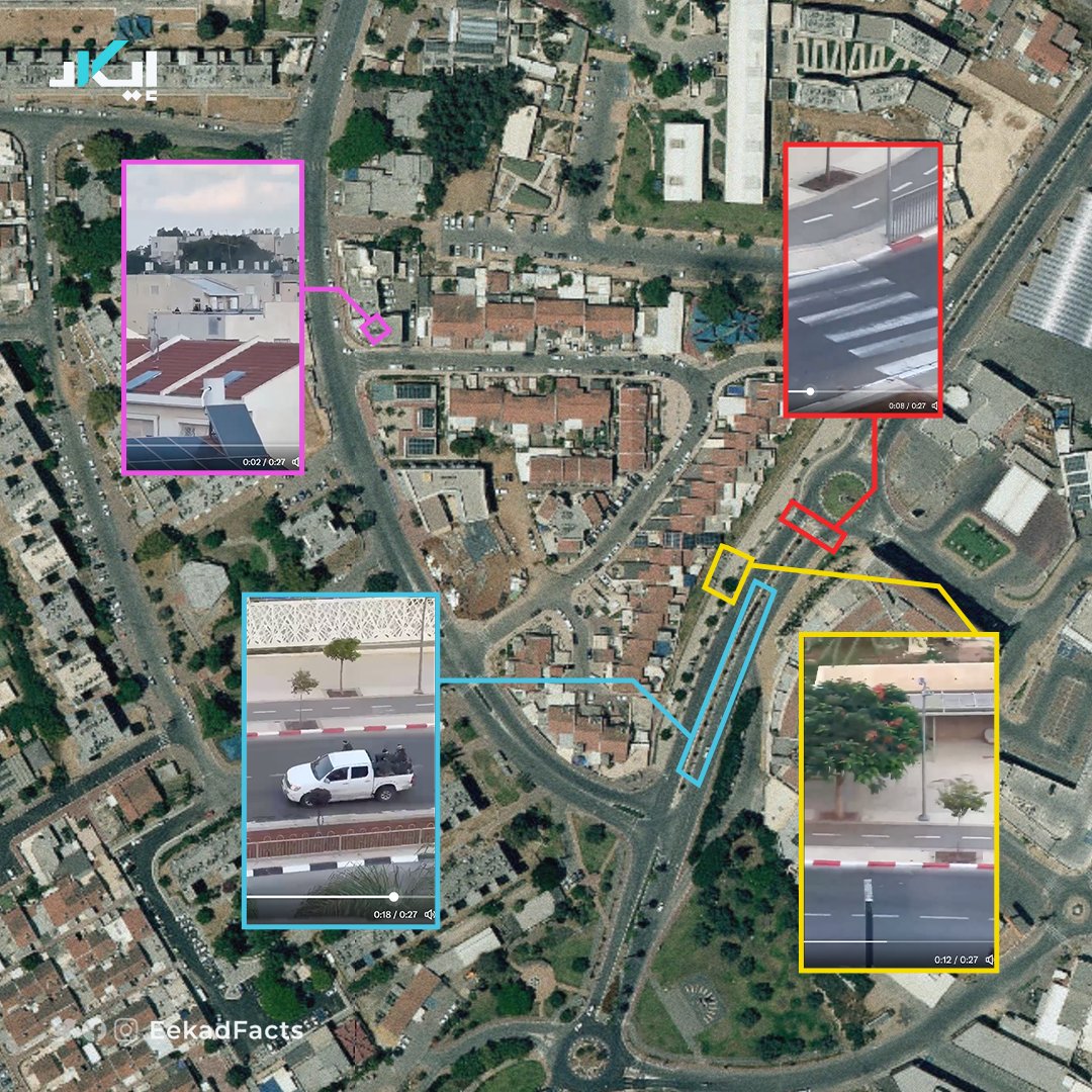 ✔️ من خلال تحليل المعالم الجغرافية في المقطع مثل المظلة ومواقف السيارات والمبنى، تبيّن أنه كان في مدينة "سديروت"، التي تبعُد عن أقرب نقطة من الحدود مع قطاع غزة قرابة 3 كيلومترات.