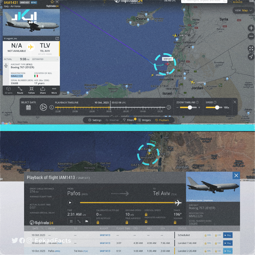 #جيوبوست | رصد فريق إيكاد طائرة عسكرية تتبع لسلاح الجو الإيطالي تحمل الرمز MM62229 من طراز Boeing 767-2EY(ER)، تهبط في تل أبيب. ✔️الطائرة وصلت فجر اليوم في حدود الساعة الثالثة صباحًا، لتقلع بعدها بعدة ساعات. ✔️بعد ساعة ونصف وصلت طائرة أخرى من ذات الطراز تتبع أيضًا لسلاح الجو الإيطالي إلى تل أبيب. ✔️كلا الطائرتين أقلعتا في نفس الوقت تقريبًا باتجاه إيطاليا، ورجحت حسابات مختصة بمتابعة حركة الملاحة الجوية أن يكون قدوم هاتين الطائرتين ضمن عمليات إجلاء الرعايا الإيطاليين من إسرائيل. #بوست #فلسطين #إيكاد #غزة #طوفان_الأقصى