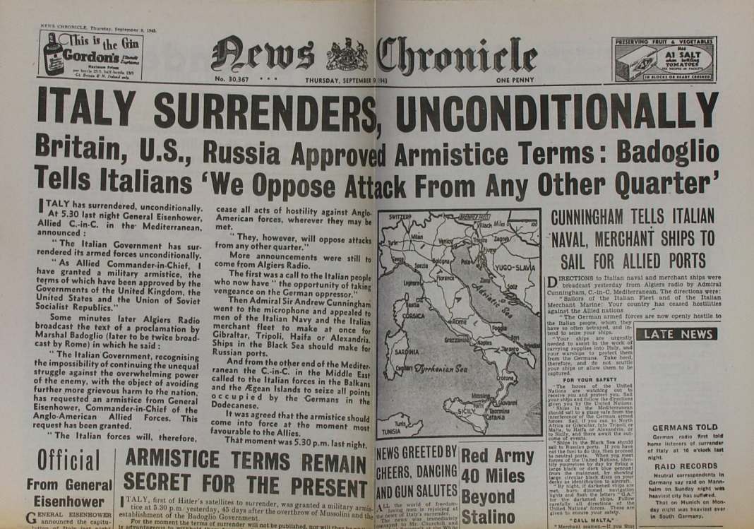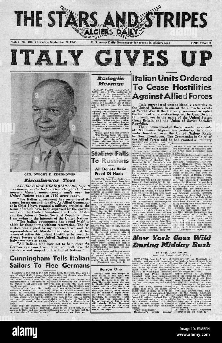 WWII en Twitter 8-Sept-1943 ITALIA CAMBIA DE BANDO:SE PONE EN MARCHA LA OPERACION EJE( LA TOMA D 🇮🇹,POR PARTE DE HITLER) Badoglio envia un telegrama urgente a Eisenhower en el q pedía q se retrasara la fecha dl armisticio unos días.A las 18:30,desde Argel,Eisenhower anuncia por👇
