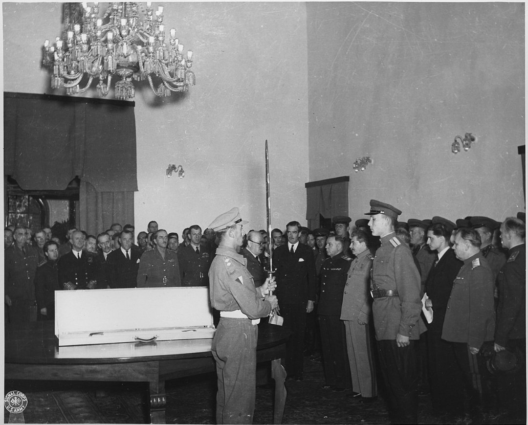 WWII en Twitter 29-Nov-1943 Antes d la cena.Churchill presentó a Stalin una espada ceremonial encargada especialmente como un regalo dl rey Jorge VI para los ciudadanos d Stalingrado. Cuando Stalin recibió la espada envainada y propuso la ejecución d 50000-100000💂oficiales🇩🇪👇