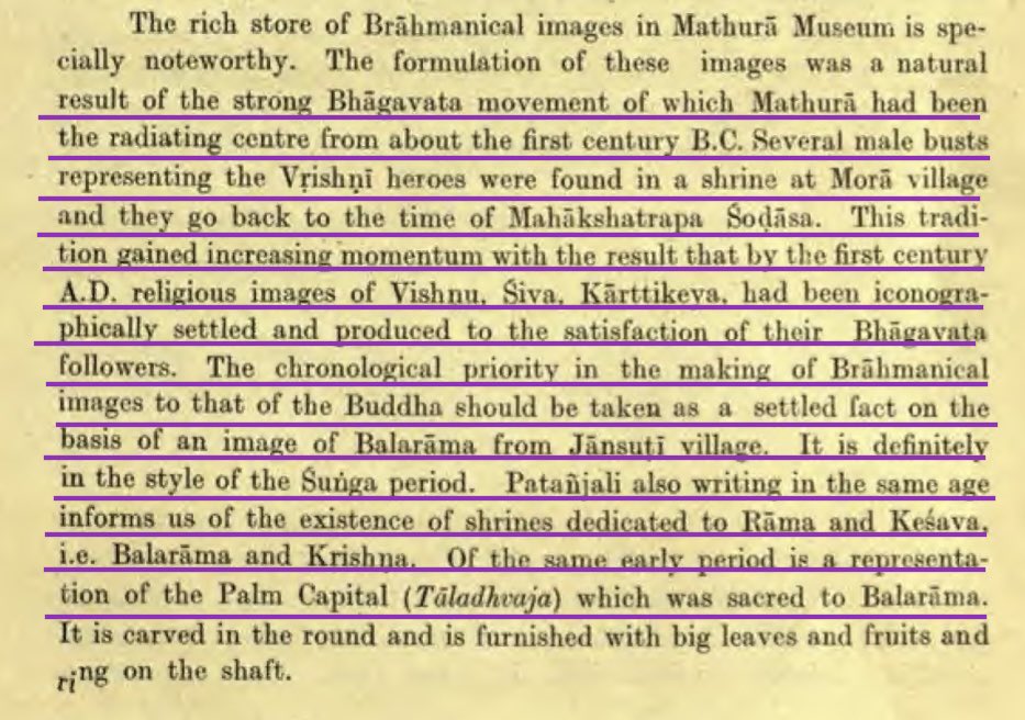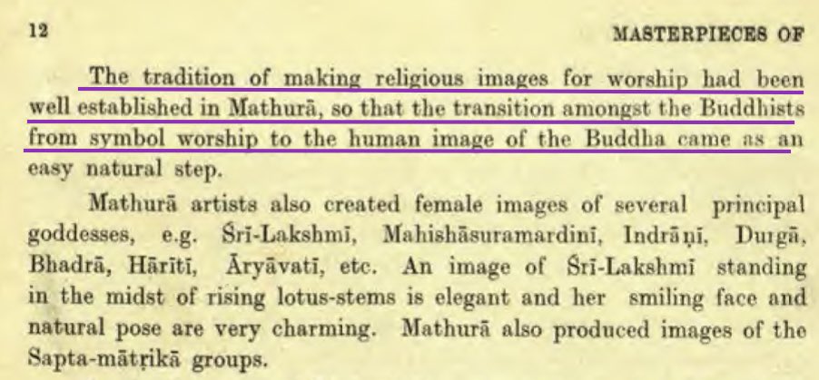 Historian V.S.Agrawala points out that Hindu Murtis of Vrishnīs like Krishna, Balarama, Vishnu, Śiva, Kārttikeya, & Devis were already present in 1st c. CE due to the Bhagāvata movement in Mathura. The first images of Buddha as a human were based on existing Hindu iconography.