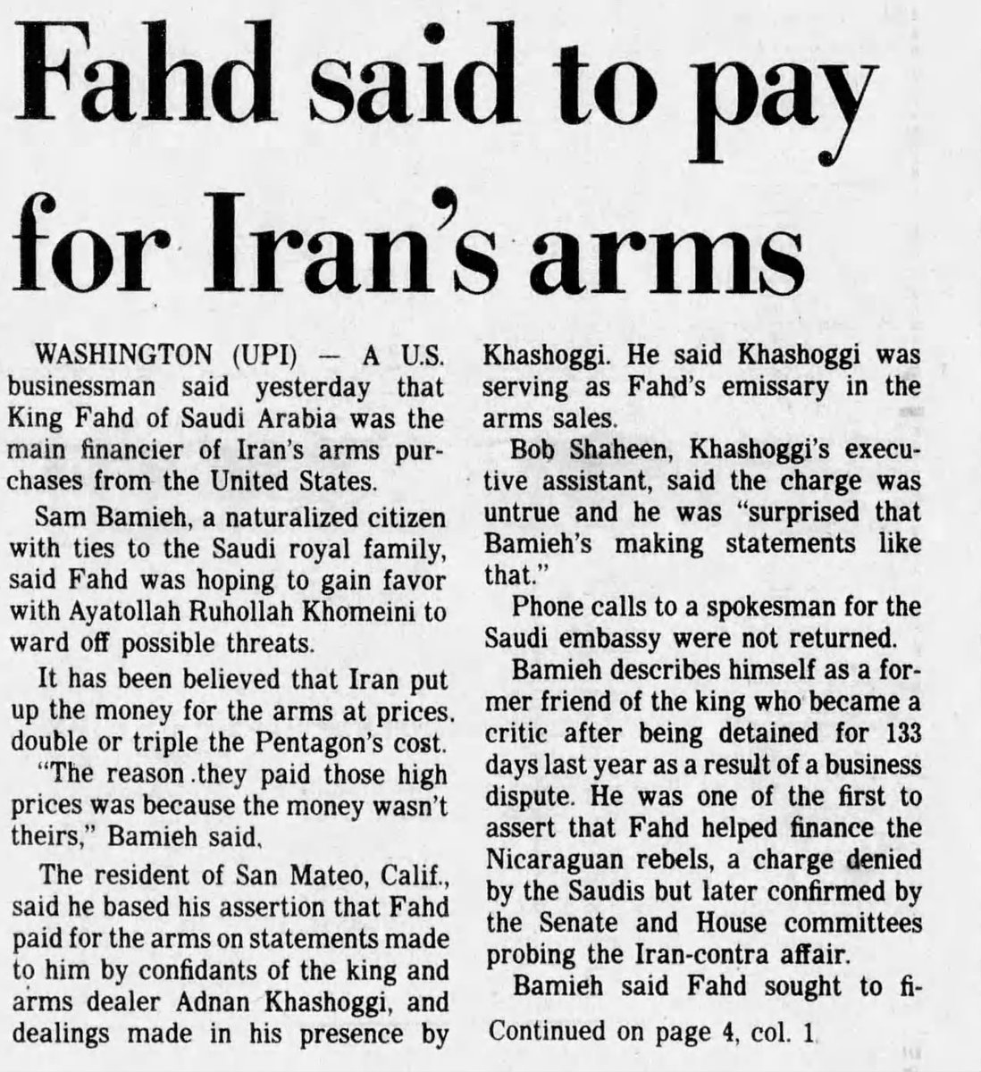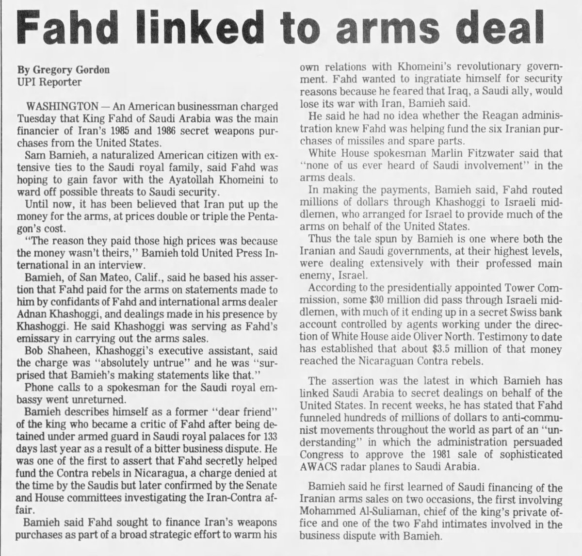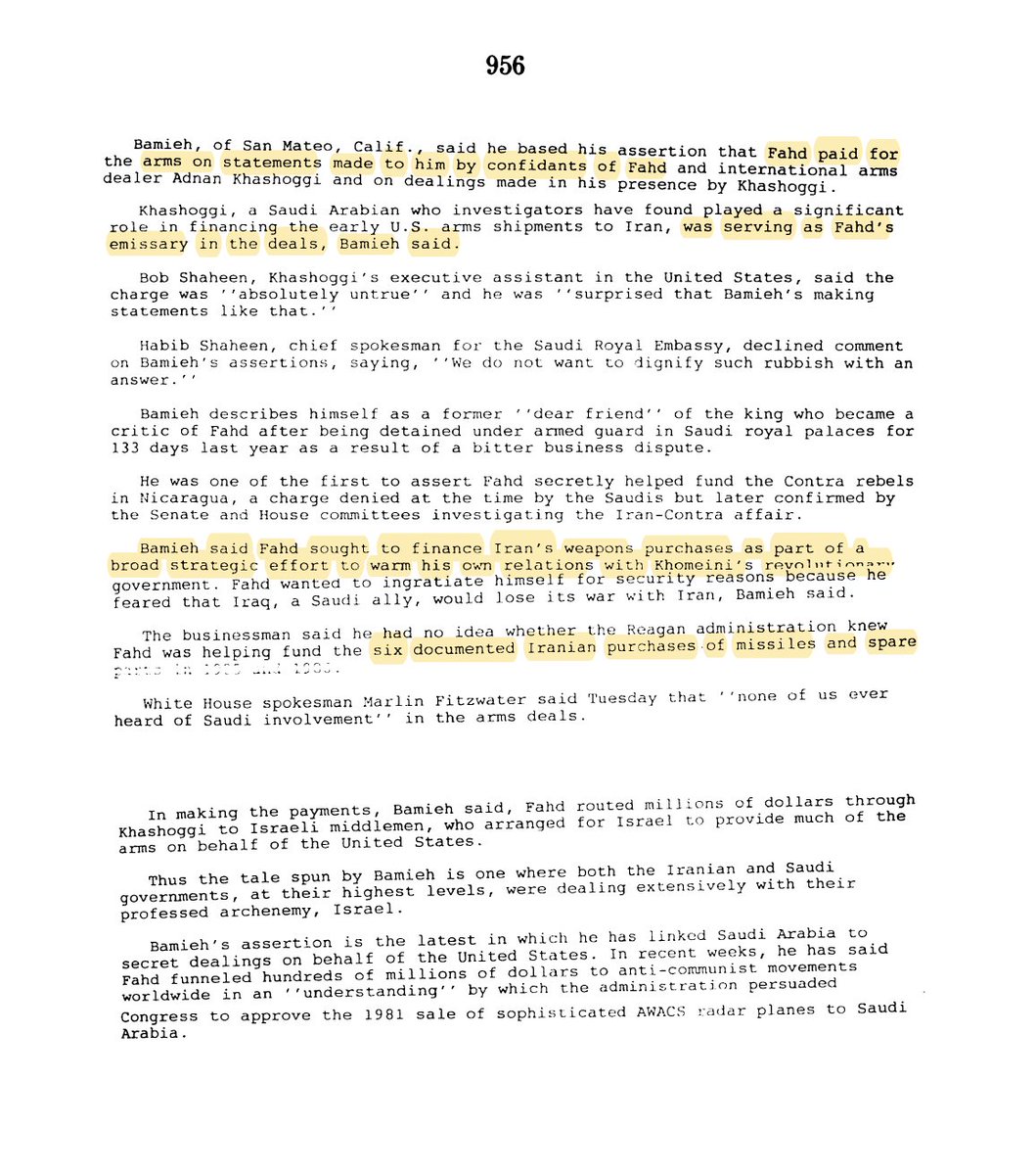 💥💥 💥💥💥💥💥💥💥 💥💥💥💥💥 ومن عجائب عصابة آل سعود أنهم استمروا بمحاولات تزويد ايران باحتياجاتها العسكرية رغم توقف الحرب بعد 08.08.1988 بانتصار عراقي حاسم .. إذن ما حاجة فهد الاستمرار بما يفعل والحرب قد انتهت ؟؟ هنا تسقط تخريجة سامي باميا التي تناقلتها الصحف الأمريكية سابقا